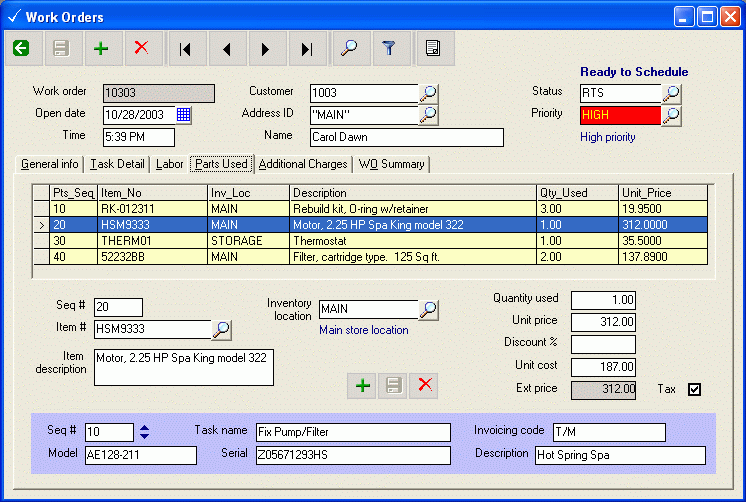 Work orders, Labor time Work orders, parts used